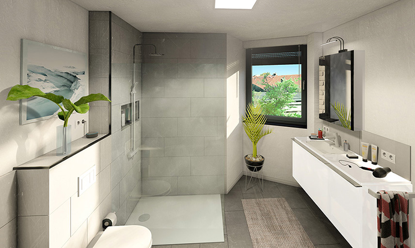 Die Bäder sind mit hochwertigen Fliesen des Markenherstellers Villeroy&Boch versehen. Zudem sind die Bäder mit Möbelwaschtischen ausgestattet.